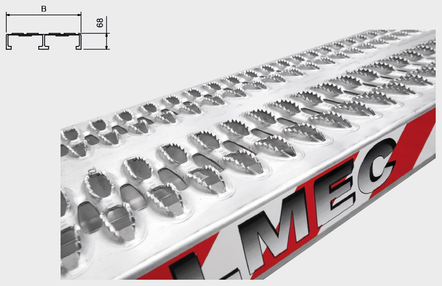 Denna serie har utformats för att möta behoven hos dem som behöver flytta tung utrustning och fordon, men också kräver en självrengörande kontaktyta med utmärkt grepp. Den innovativa, tunna, extruderade och skurna profilen som används vid tillverkningen av dessa ramper ger produkten dessa egenskaper som är särskilt värdefulla av tillverkare av lätta släpvagnar. Fordon och utrustning med gummihjul eller band kan flyttas i alla väderförhållanden och med fullständig säkerhet. Serien är tillverkad utan upphöjda kanter. Olika typer av huvudanslutningar kan monteras på begäran och produkten levereras med nödvändiga förankringsflikar. Bild 2 är standard förankringsflik och övriga bilder på förankringsflikar kan fås på begäran.